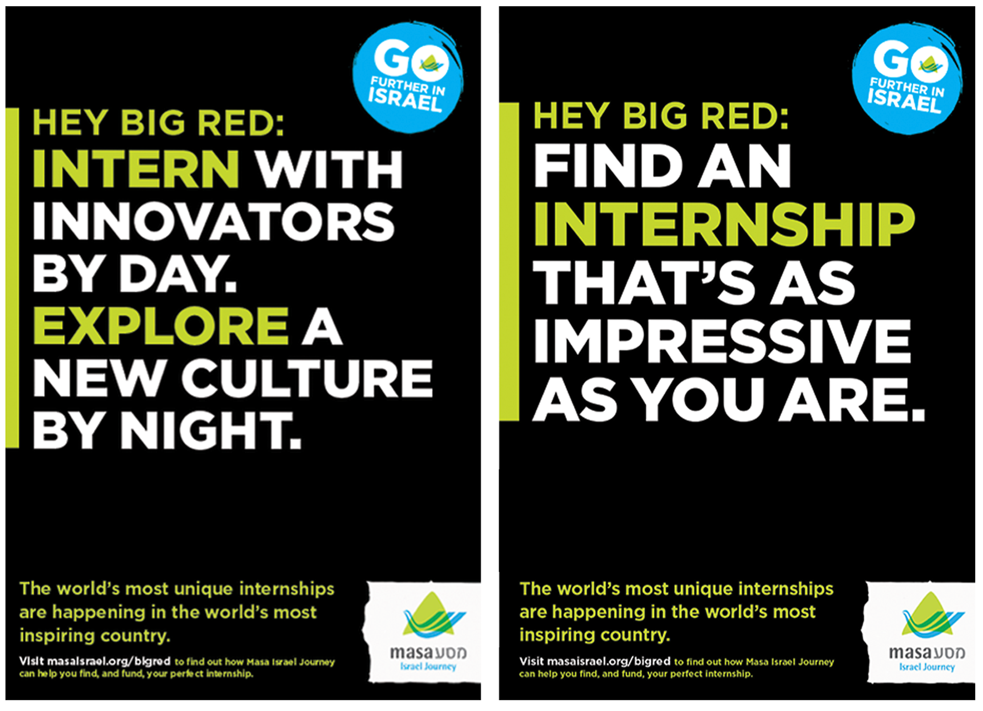 A campaign encouraging Jewish students at leading colleges and universities to apply for exceptional internship opportunities in Israel.